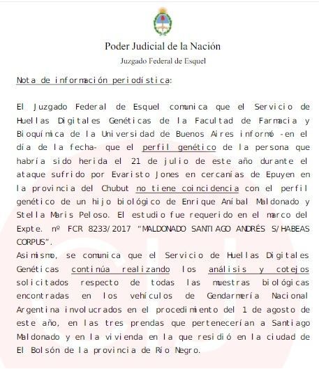 En un comunicado se informó que “las manchas de sangre de quien fue herido por un puestero el pasado 21 de julio no tiene coincidencia con el perfil genético de un hijo biológico de Maldonado”.