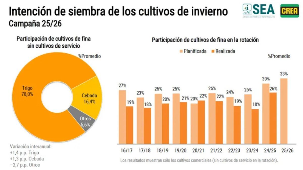 Además, un 33% señaló que planea incorporar cultivos de granos finos, fundamentalmente trigo, en la rotación agrícola del ciclo 2025/26, lo que representa la cifra más elevada de la serie de la encuesta SEA CREA.