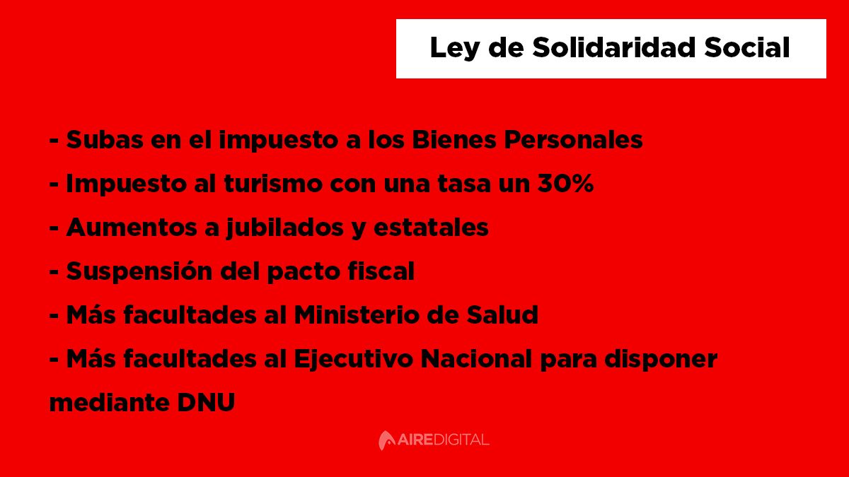El megaproyecto para la emergencia económica incluye subas en el impuesto a los Bienes Personales, un tributo para las compras en dólares con una tasa un 30%, la autorización al gobierno a otorgar aumentos a jubilados y estatales y, posiblemente, la inclusión de la suspensión del pacto fiscal.