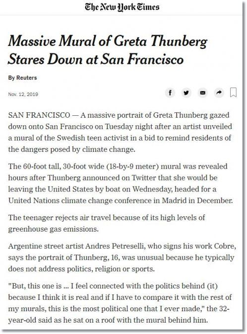 "Cobre" lo hizo de nuevo: el reconocido artista santafesino volvió a trascender las fronteras con su obra. Esta vez, se trata de un mural gigante que lleva el rostro de la adolescente sueca Greta Thunberg -referente actual de la lucha contra el cambio climático- que se emplaza en San Francisco (Estados Unidos) y que motivó que Andrés Iglesias sea reconocido por algunos de los más importantes medios de comunicación a nivel global.