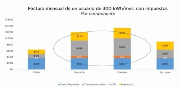 Iguacel apoyó su exposición con un gráfico en donde compara los precios finales de la energía entre Buenos Aires y Santa Fe.