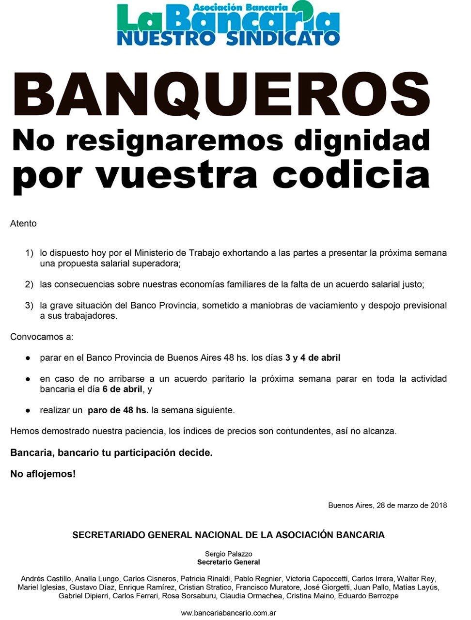 A través de un comunicado, los trabajadores además, advirtieron que, de no recibir respuesta por parte de los empresarios bancarios, se realizará un paro de 48 horas la semana siguiente a la primera de abril.