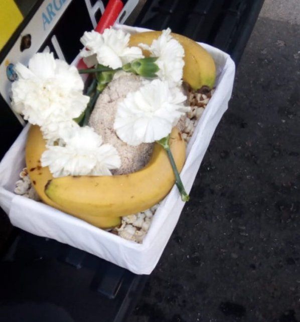 Finalmente, cuando personal especializado se hizo cargo de la situación y actuó sobre el objeto, se confirmó que no se trataba de material explosivo sino una simple caja pequeña de cartón blanco. Y contenía dos o tres bananas, que rodeaban a un objeto con forma de pollo o de milanesa de pollo, con cuatro o cinco claveles blancos superpuestos. Todo eso sobre un pequeño colchón de pororó y una vela roja y blanca.