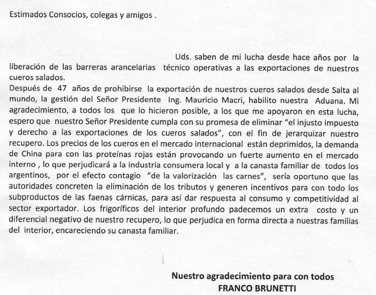 “Después de 47 años de prohibirse la exportación de nuestros cueros salados desde Salta al mundo, la gestión del señor presidente Mauricio Macri habilitó nuestra Aduana. Mi agradecimiento a todos los que lo hicieron posible, a los que me apoyaron en esta lucha. Espero que nuestro presidente cumpla con su promesa de eliminar el injusto impuesto y derechos de exportaciones de los cueros salados”, admitió Brunetti en una carta pública y en la que baja notablemente el tenor de sus denuncias.