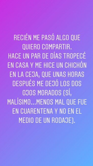 "Recién me pasó algo que quiero compartir. Hace un par de días tropecé en casa y me hice un chichón en la ceja, que unas horas después me dejó los dos ojos morados (sí, malísimo...menos mal que fue en cuarentena y no en el medio de un rodaje)", escribió la actriz y directora en sus historias de Instagram.
