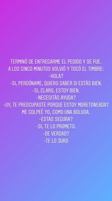 Y detalló cómo fue la conversación en la que el repartidor indagó si Jazmín necesitaba asistencia: "Terminó de entregarme el pedido y se fue. A los cinco minutos volvió y tocó el timbre. 'Perdoname, quiero saber si estás bien. ¿Necesitás ayuda?' Uy, ¿te preocupaste porque estoy moretoneada? Me golpeé yo, como una boluda".