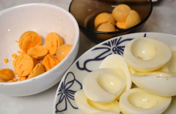 Cuando los huevos estén cocidos, pasarlos por agua fría y luego pelarlos con cuidado para no romper la clara, la cual debe contener perfectamente el relleno que le pongamos.