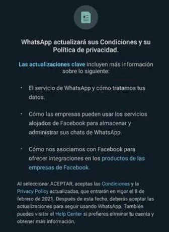 WhatsApp, la aplicación de mensajería con más de 2.000 millones de descargas, avisó a sus usuarios que cambiará los términos y condiciones de uso de la app desde el 8 de febrero de 2021. Con un cartel de forma amistosa y simple, estilo Pop Up al iniciar la aplicación, quienes no acepten deberán realizar algo diferente.