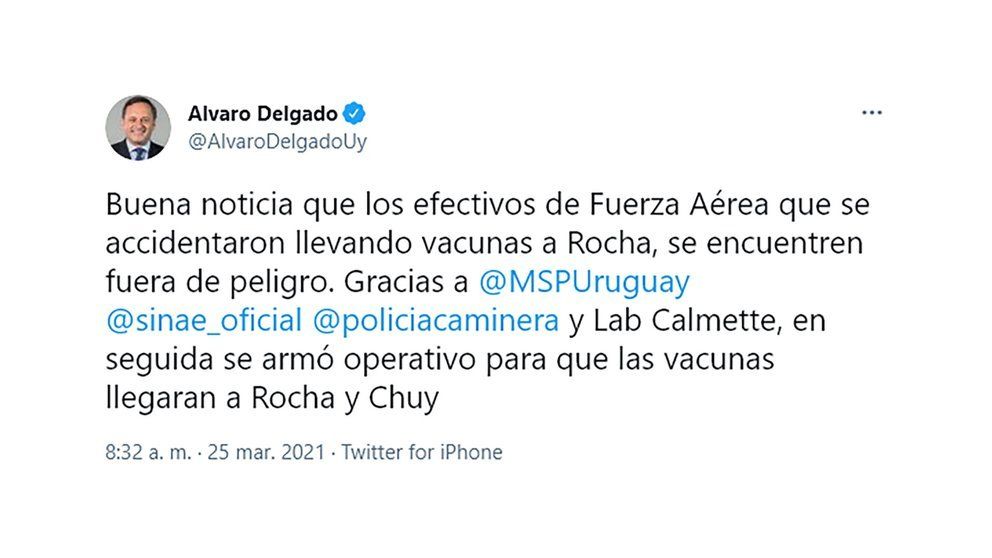 El Ministerio de Defensa y el director de Salud de Rocha, Diego Pintado, informaron que las dosis de la vacuna del laboratorio de Pfizer que eran trasladadas en el helicóptero a ese departamento -unas 300- se perdieron, ya que hubo fuego a raíz del accidente.