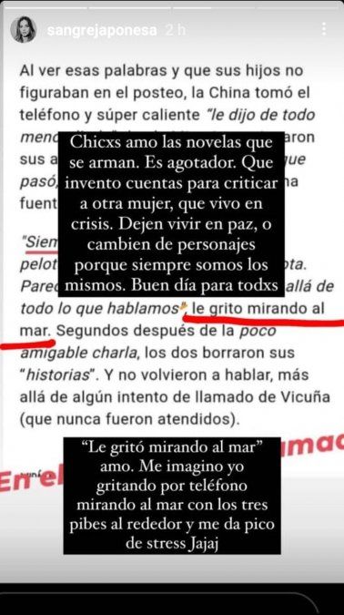 Lo cierto es que, en medio de esta polémica, la China Suárez salió al cruce de las versiones e hizo su descargo mediante un post en Instagram. "Chicxs, amo las novelas que se arman... Es agotador. Que invento cuentas para criticar a otra mujer, que vivo en crisis... Dejen vivir en paz o cambien de personajes porque siempre somos los mismos", escribió en Insta Stories.