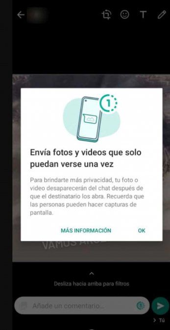 Una característica de otras plataformas, como Telegram, Instagram o Snapchat desembarcó en WhatsApp, la “Visualización única”. Como su nombre indica, permite enviar fotos o videos que se borran automáticamente después de verlos una vez. Como en Misión: imposible: “este mensaje se autodestruirá”.