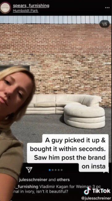 “Vendí un sofá que me regalaron y lo publicité en Facebook Marketplace por 500 dólares. Un sujeto se interesó y me lo compró en el acto. Vi que puso la marca en Instagram. *Busqué el nombre en Google*. Es un sofá de más de 20,000 dólares... USADO”, se quejó en su video arrepentida por no haber buscado información antes de venderlo. Sucede que la pieza de la que se deshizo fue confecciona por la marca Vladimir Kagan, y lo que para ella era un simple sillón, en realidad se trataba de un artículo único de diseño.