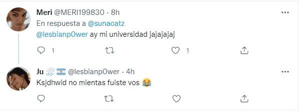 Si bien esta imagen es un meme que suele verse en redes sociales como Facebook, despertó la reacción de otros usuarios de la red social del pajarito que contaron su experiencia de trabajar en grupo para la Facultad. "Una vez pasó algo así en mi curso. Un chico se quejó de que la chica de su grupo no hizo nada y que cuando vio sus estados, la vio en una fiesta, o sea, entiendo que ella no hizo, pero decir que estaba en una fiesta frente al profe y todos no da", expresó un usuario.