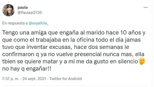 "Tengo una amiga que engaña al marido hace 10 años. Como él trabajaba en la oficina todo el día jamás tuvo que inventar excusas. Hace dos semanas le confirmaron que ya no vuelve presencial nunca más, ella también se quiere matar y a mí me da gusto en silencio. No hay que engañar", expresó otra usuaria de nombre Paula.