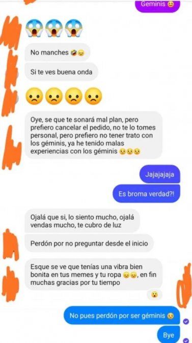 "Me cancelaron un pedido nomás porque se enteró que soy géminis. Uy, pues perdón, nomás no te funeo por qué me dio risa. ¿A quién más ofendí con mi signo?", expuso Tania Bazarcito en su perfil al compartir la anécdota. La extraña conversación superó las barreras de Facebook y llegó a otras redes sociales. Al punto que se popularizó en TikTok con cientos de comentarios graciosos.