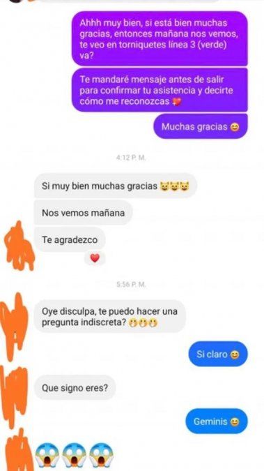 Tania le contestó que géminis, lo que provocó una respuesta muy rara por parte de la clienta: "No manches, si te ves buena onda". "Oye, sé que te sonará mal plan, pero prefiero cancelar el pedido. No te lo tomes personal, pero prefiero no tener trato con los géminis, ya he tenido malas experiencias con los géminis".