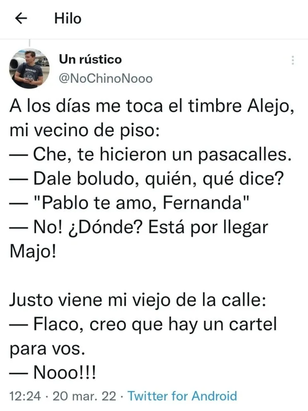 A los dìas, Alejo, el vecino de piso del joven le toca el timbre para decirle que le habían hecho un pasacalles. "Dale boludo, quién, qué dice?", le preguntó el tuitero. "Pablo te amo, Fernanda", respondió el residente.