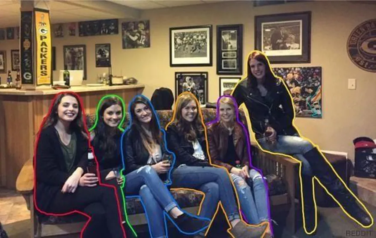 Según informa el sitio web La Nación, es que si se ve con rapidez la fotografía, parece ser una instantánea normal que se sacaron las amigas que querían inmortalizar el momento en lo que parece ser un bar. Sobre el sillón, se ve a cinco de ellas y una está sentada en el apoya brazos de madera. Cada una de las mujeres tiene en su mano una bebida. En el caso de la primera, carga una cerveza sobre sus piernas cruzadas, la segunda, en tanto, tiene un vaso en su mano que se ve muy poco. En el caso de la tercera, tiene una copa de vino. La cuarta tiene ocultas las manos, pero muy claro el pliegue de sus piernas. Mientras que la quinta y la sexta, más alejadas del resto, se ven intactas.