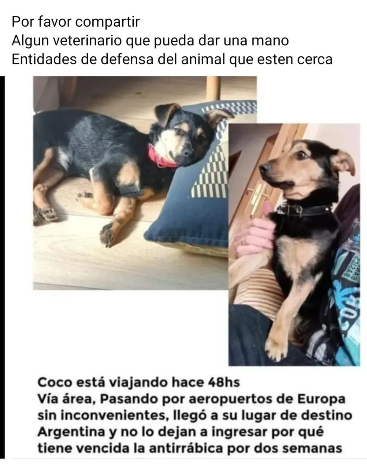 El perro Coco se encuentra retenido en Ezeiza porque argumentan que tiene vencida la vacuna antirrábica desde hace dos semanas. La dueña está desesperada. Luego de haber viajado por Europa sin inconvenientes, la mascota volvió a Argentina y la tienen varado en Migraciones hace dos días.