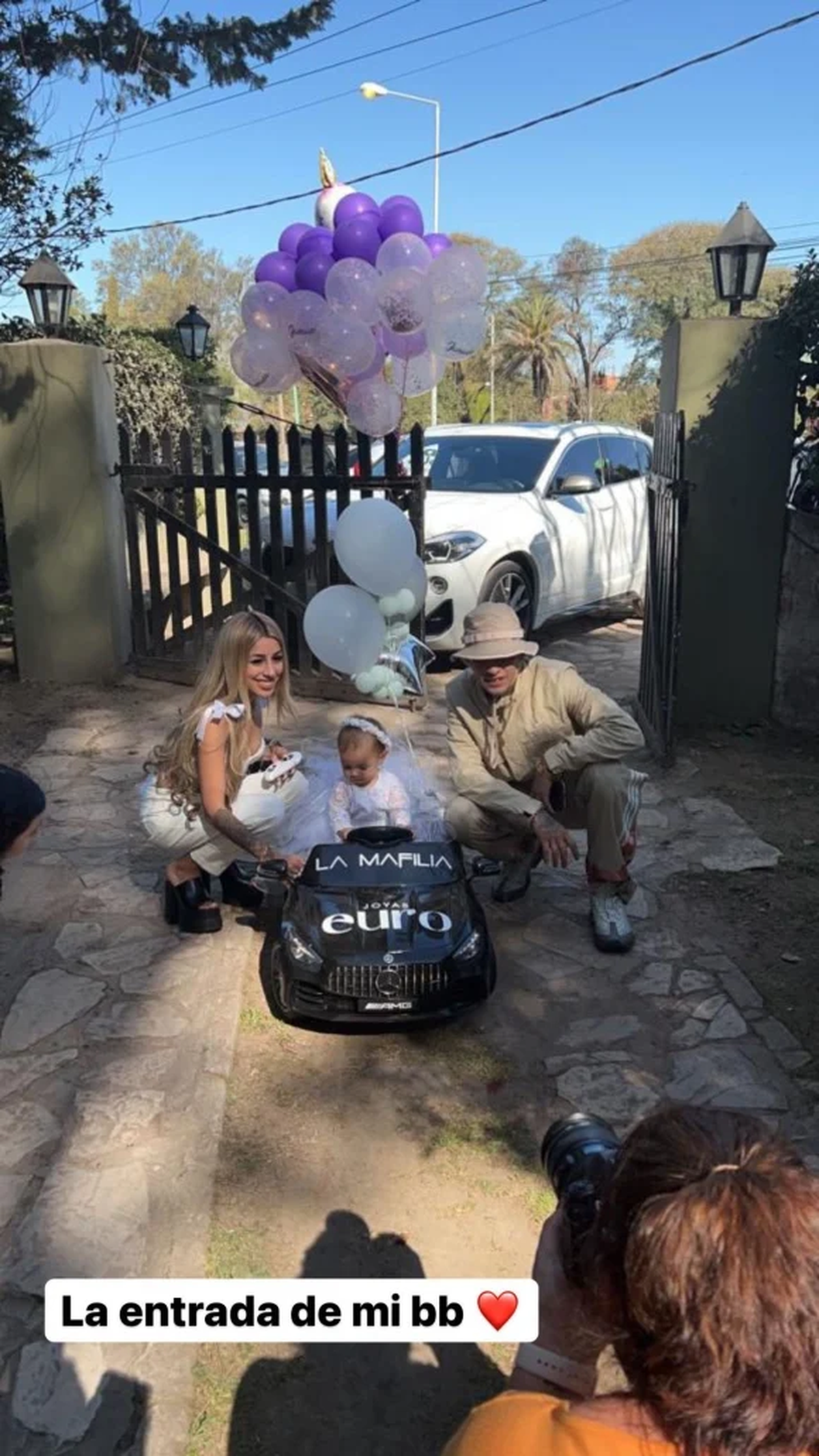 La fiesta contó con animadores, juegos, un catering increíble, y tuvo la gran entrada de la cumpleañera a bordo de un automóvil eléctrico de marca en el que se puede leer “La mafilia” como en los vehículos del cantante, que posa a su lado con un sombrero cubriéndole la cara.