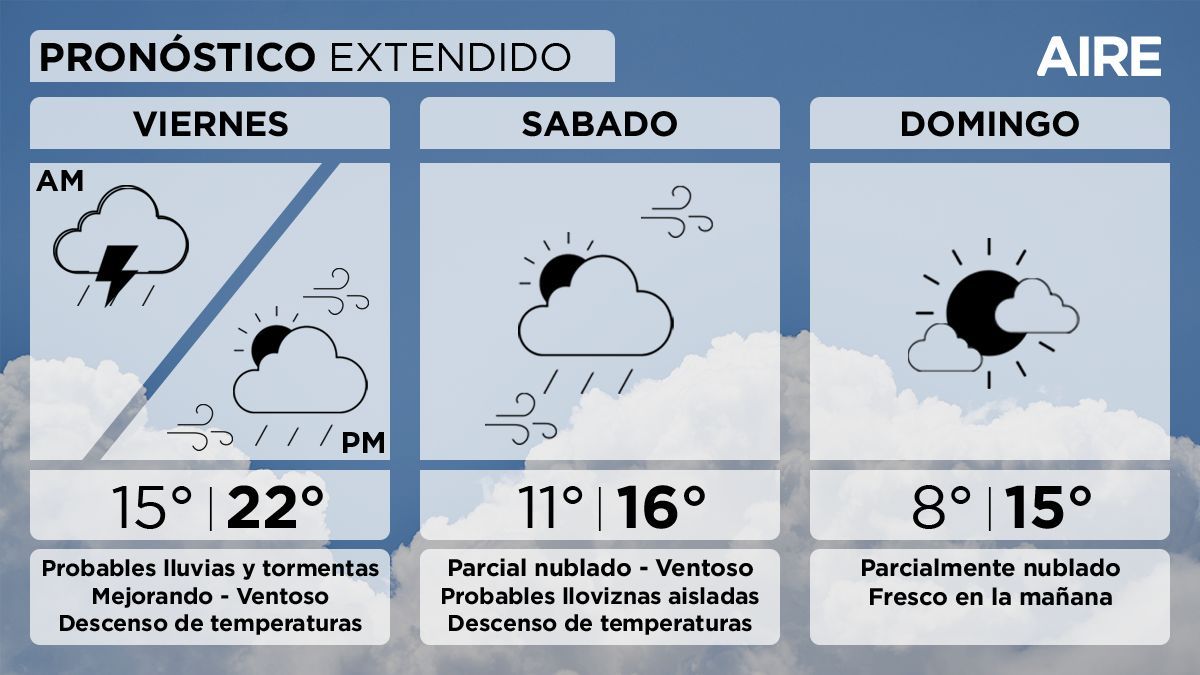 VIERNES: condiciones inestables, con probables lluvias y algunas tormentas en la mañana, pero mejorando desde la tarde. Temperaturas en descenso con mínima de 15° a final de la jornada, 19° por la mañana, máxima de 22° y viento leve a moderado del norte rotando al sur con posibles ráfagas fuertes.