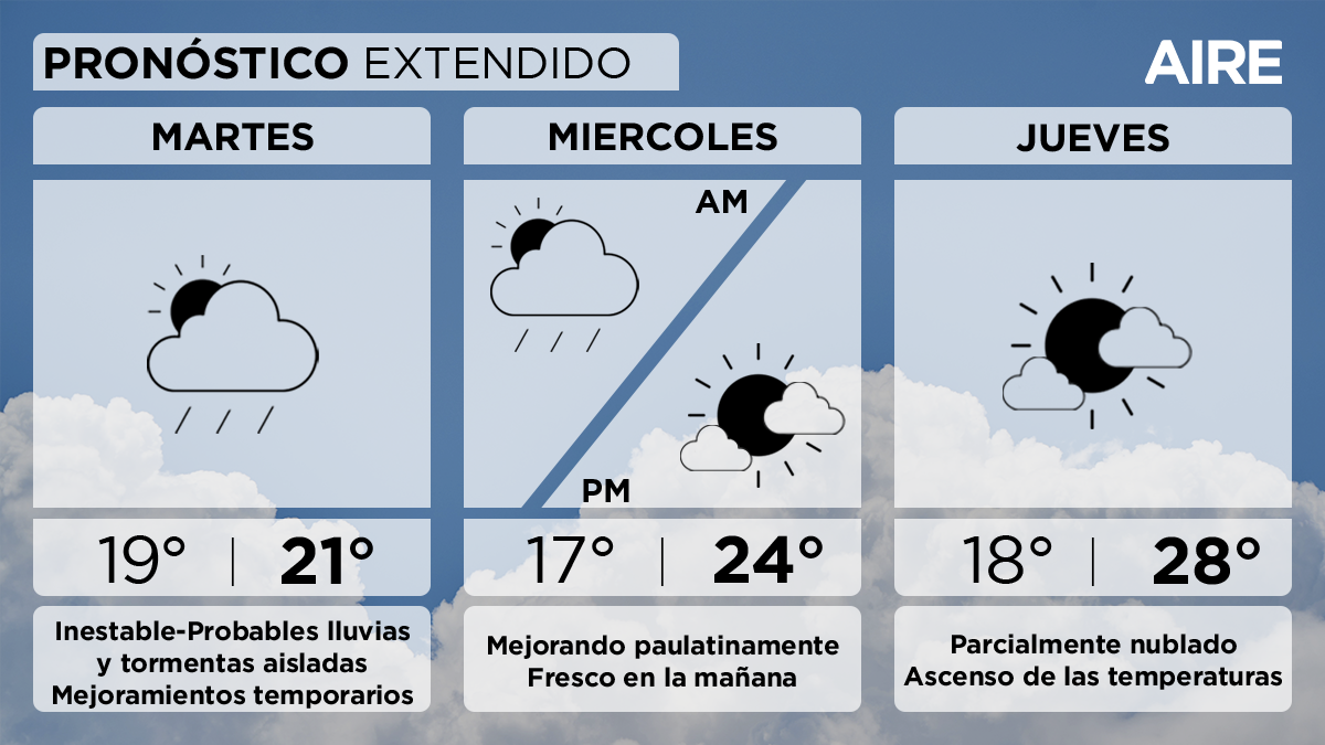 El técnico superior en Meteorología de AIRE, Pablo Lucero, indicó que, hacia el próximo fin de semana, los modelos continúan indicando una posible inestabilidad y temperaturas máximas que rondarán los 30°.