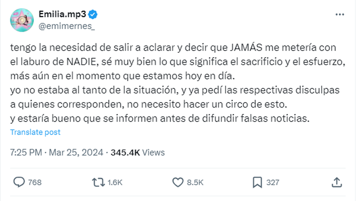 El conflicto se volvió viral y Emilia Mernes no tuvo opción más que dar su versión de los hechos: “Tengo la necesidad de salir a aclarar y decir que JAMÁS me metería con el laburo de NADIE, sé muy bien lo que significa el sacrificio y el esfuerzo, más aún en el momento que estamos hoy en día”, se expresó la cantante.