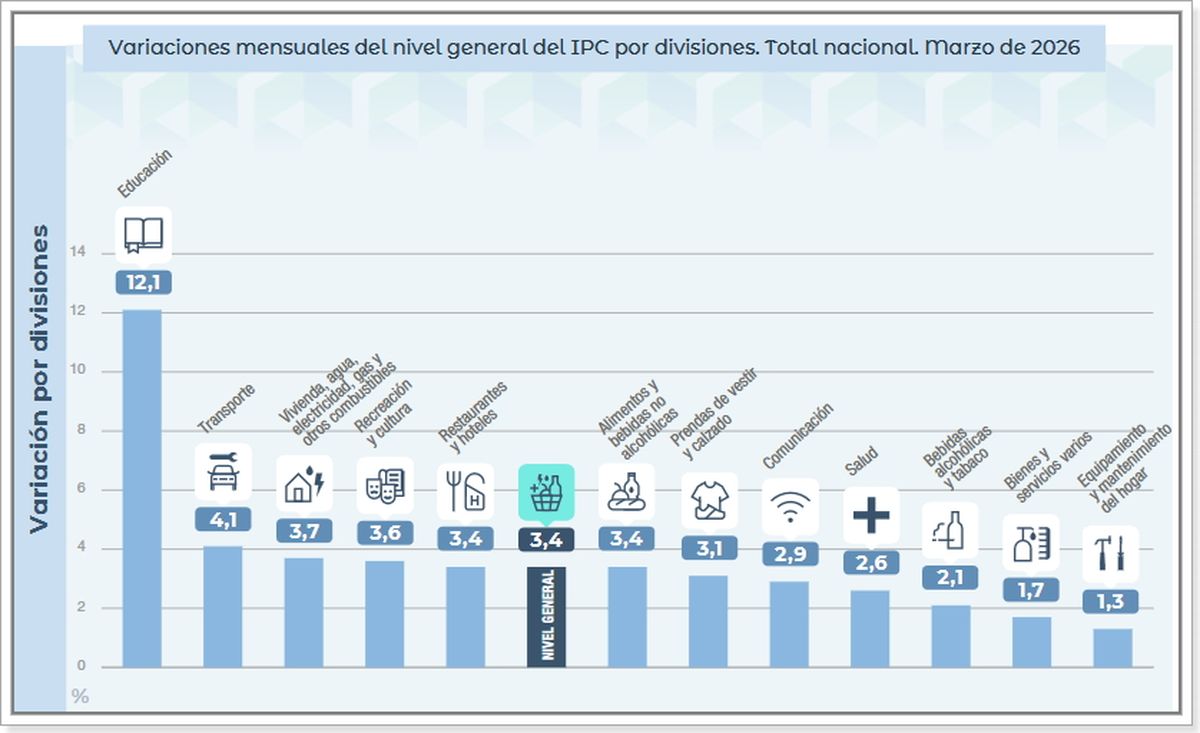 Con un salto del 3,4% en marzo, el rubro “Alimentos y bebidas no alcohólicas” se movió en línea con el índice general y acumuló un +11,8% en los primeros tres meses de 2026. En el último año, el aumento llega al +32,7%.