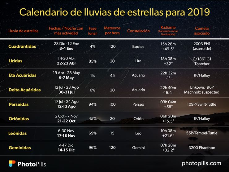 Cada lluvia de estrellas que se da por año, lleva un nombre específico según la zona del cielo en la que se produzca. Sus nombres son: Cuadrántidas, Líridas, Eta Acuáridas, Delta Acuáridas, Perseidas, Oriónidas, Leonidas y Gemínidas. Cada una se da en una constelación específica, por el paso de un cometa específico y con una intensidad y visibilidad diferente.