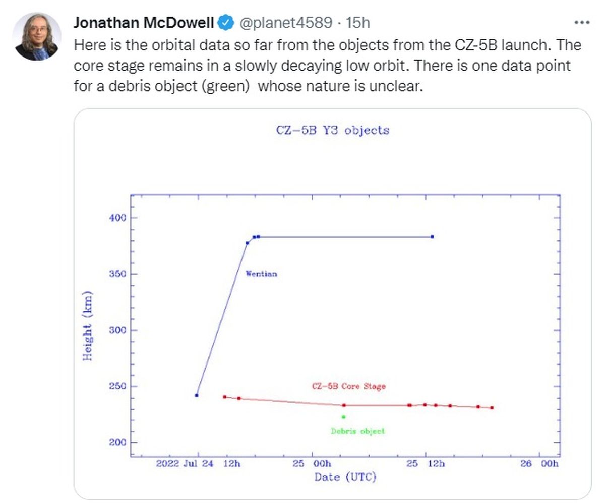 Una publicación del astrofísico Jonathan McDowell, del Centro Harvard-Smithsoniano de Astrofísica, indica que una parte del cohete chino "permanece en una órbita baja que decae lentamente".