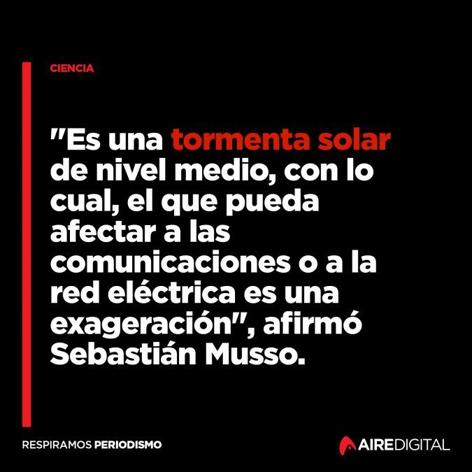 Si la tormenta fuera importante podría afectar a algún satélite, pero Musso sostuvo que esto no es así. "Es una tormenta de nivel medio, con lo cual, el que pueda afectar a las comunicaciones o a la red eléctrica es una exageración", afirmó.