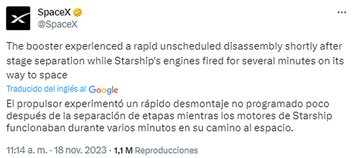 Pero "el propulsor experimentó un rápido desmontaje no programado poco después de la separación de etapas, mientras los motores de Starship funcionaban durante varios minutos en su camino al espacio", indicaron.