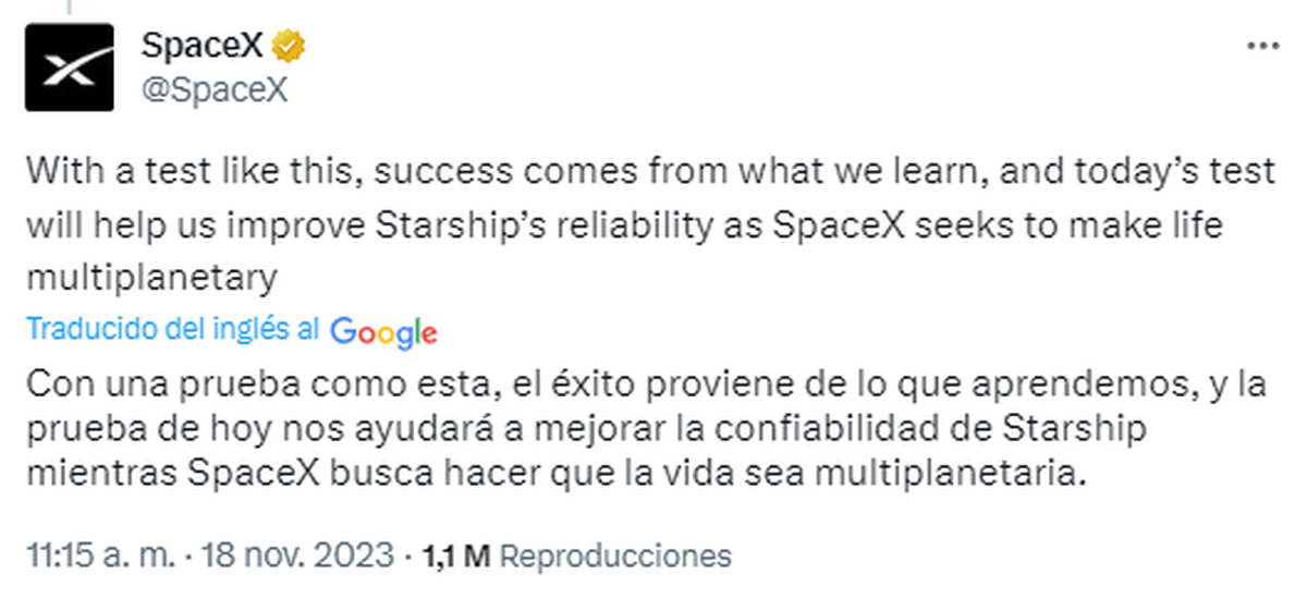 "Con una prueba como esta, el éxito proviene de lo que aprendemos, y la prueba de hoy nos ayudará a mejorar la confiabilidad de Starship mientras SpaceX busca hacer que la vida sea multiplanetaria", señalaron.