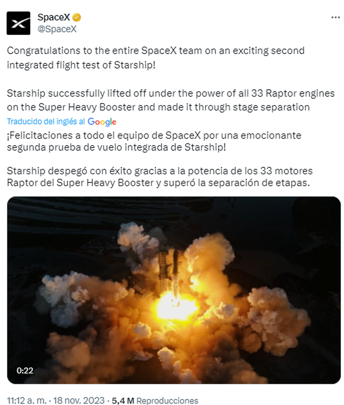 "Starship despegó con todo éxito bajo el impulso de los 33 motores Raptor, del propulsor Super Heavy y alcanzó la fase de separación de sus dos etapas", publicaron desde la compañía en la red social X.