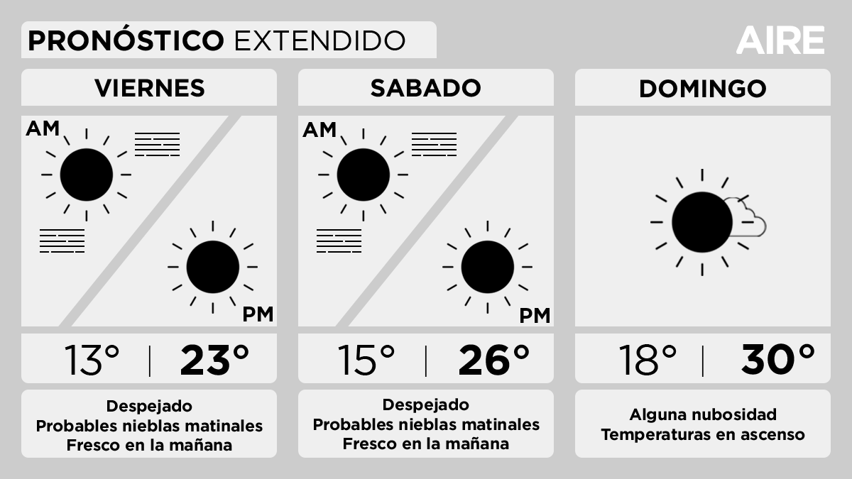 - El sábado también estará despejado. Posibles bancos de niebla en las primeras horas. Temperatura mínima de 15°, máxima de 26° y viento leve a moderado del noreste.