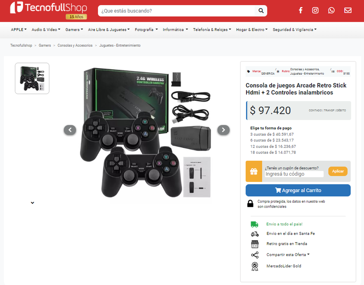 Oferta Exclusiva 10% de descuento con Nuestro Código Especial ----- https://www.tecnofullshop.com.ar/producto/5198-consola-de-juegos-arcade-retro-stick-hdmi-2-controles-inalambricos