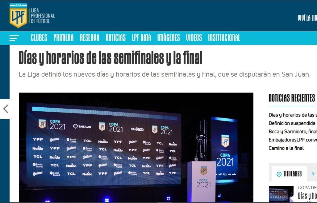Los dirigentes de la Liga Profesional de Fútbol y de AFA llegaron a un acuerdo y fijaron los días y horarios en que se disputarán las semifinales y la final de la Copa de la Liga. El torneo se definirá de manera íntegra en San Juan.