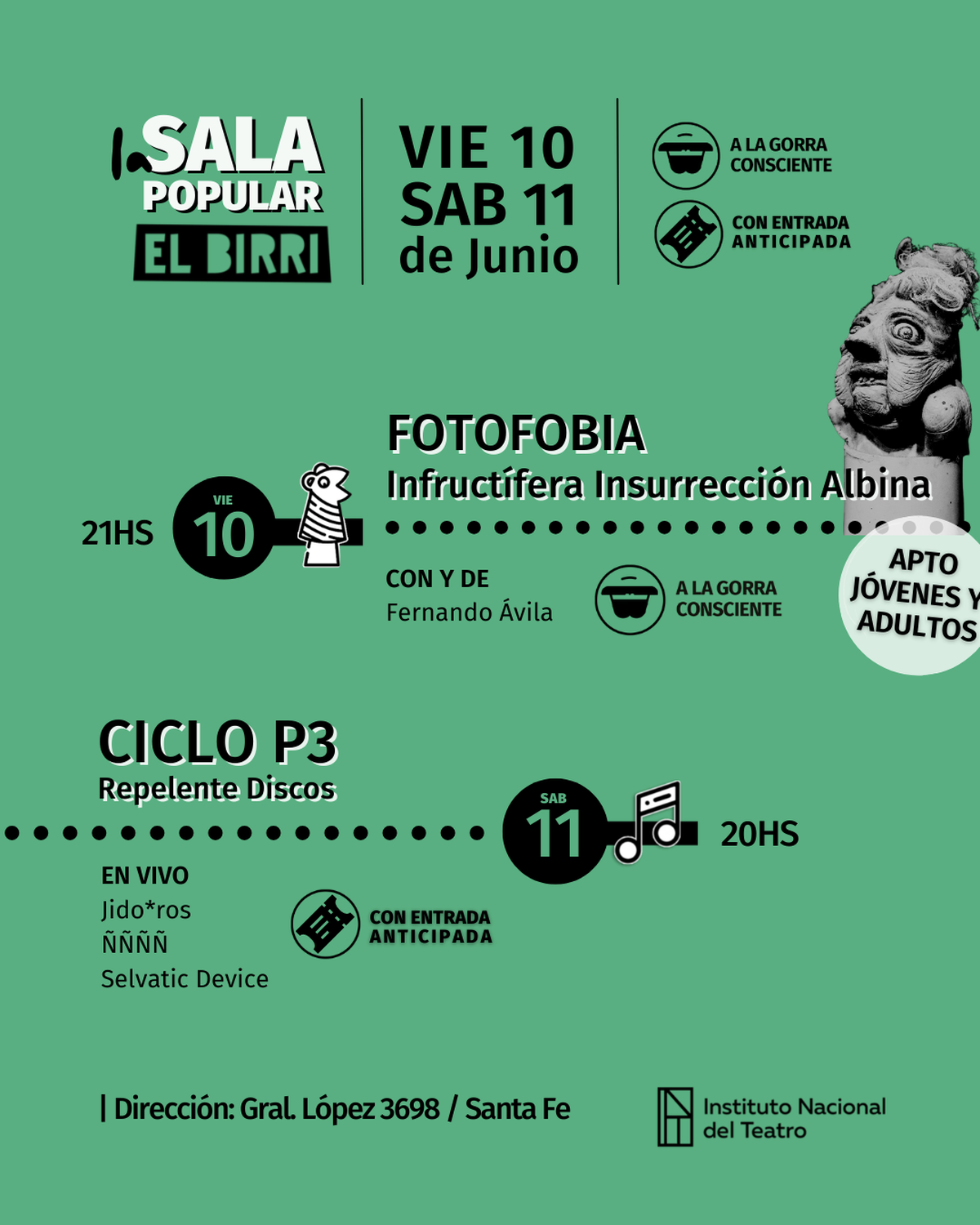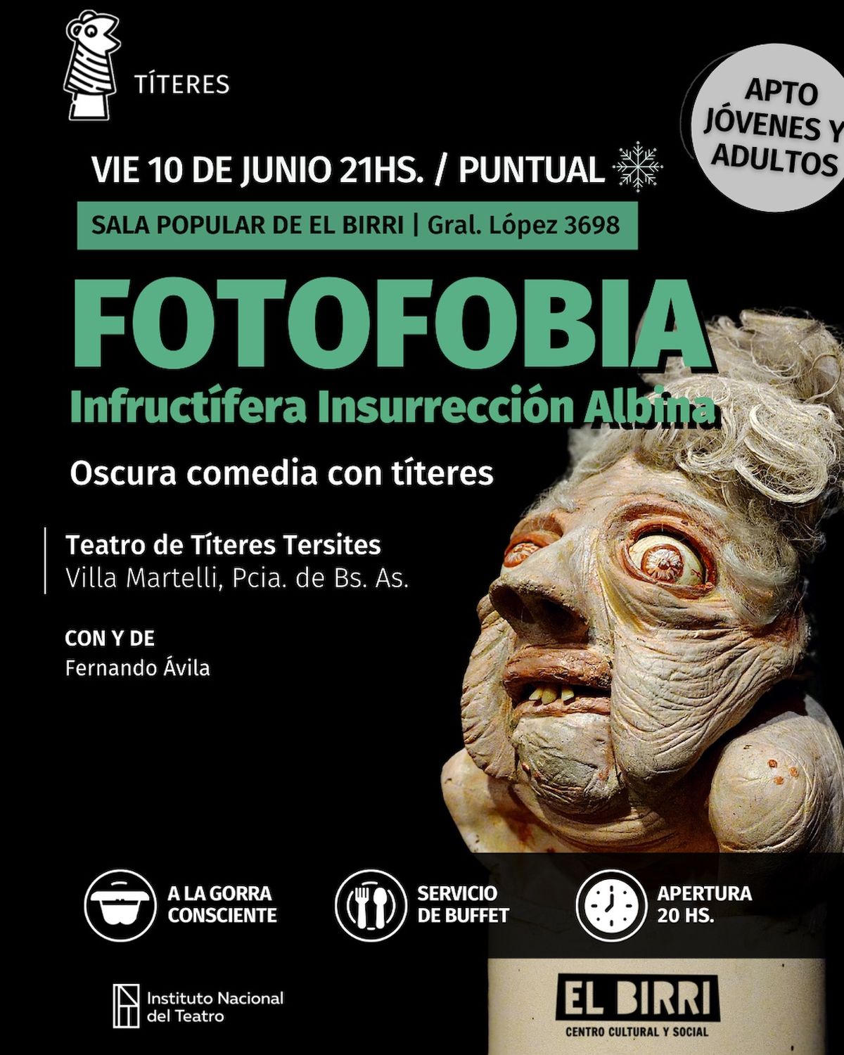 El viernes 10 de junio, El Birri recibe una oscura comedia con títeres desde Villa Martelli, provincia de Buenos Aires. A las 21 comienza la obra “Fotofobia. Infructífera Insurrección Albina”. Fotofobia no es una tragedia, es un miedo, una aversión a esa luminosidad iridiscente que es la existencia. Es morirse de soledad en medio de la vida. Pero también es un compendio de piezas breves vinculadas por el olvido. Las piezas serán presentadas por un Tersites Fantasmagórico que hace las veces de muerto parodiando a la propia muerte. El espectáculo está destinado a jóvenes y adultos y la apertura de la sala es a las 20, con servicio de buffet y barra.