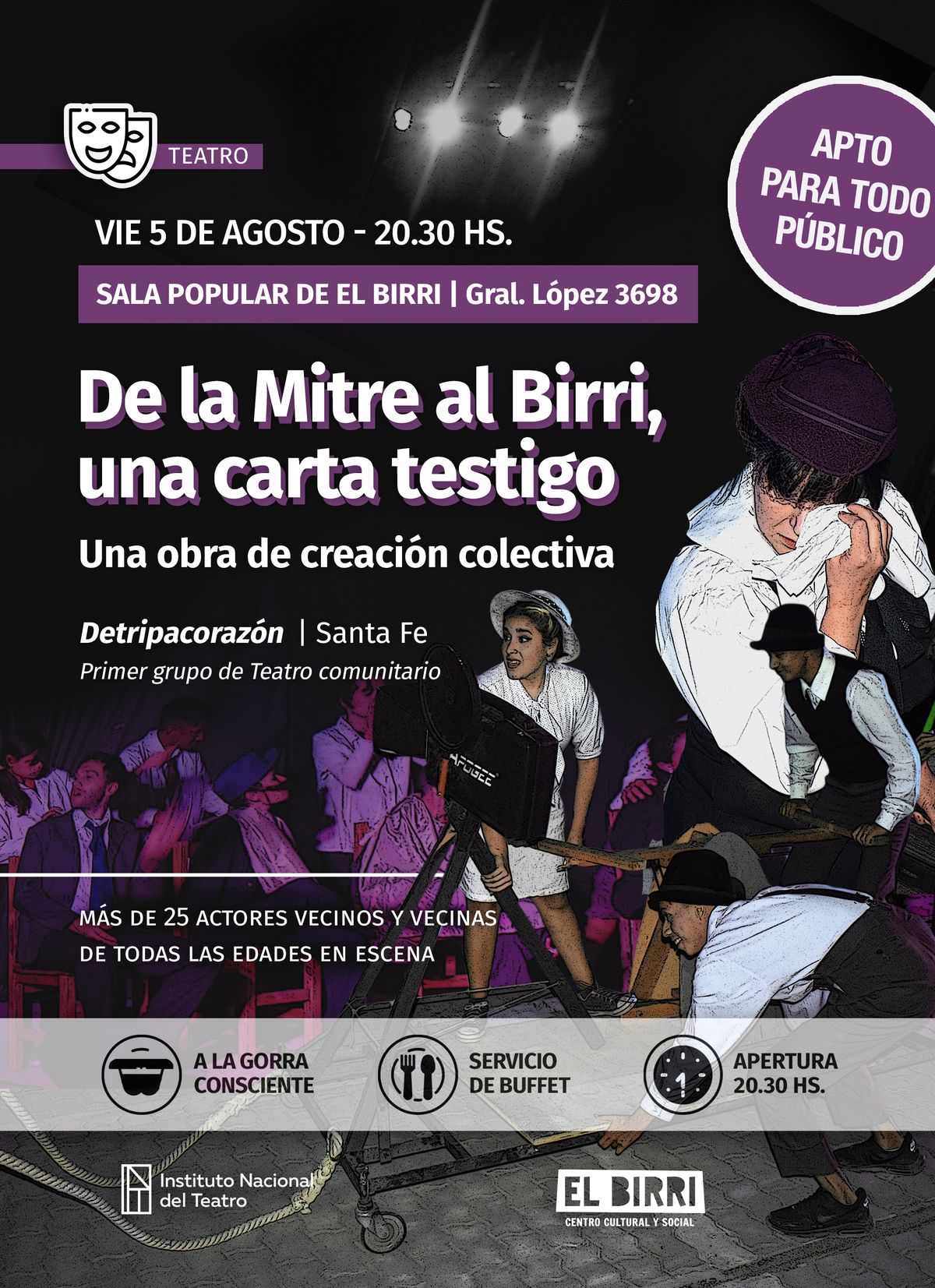 La jornada continúa a las 20.30 en la Sala Popular de Teatro con la presentación de la obra “De la Mitre al Birri, una carta testigo” del Grupo de Teatro Comunitario Detripacorazón de Santa Fe. Se trata de una obra de teatro popular apta para todo público llevada adelante por el primer grupo de teatro comunitario en Santa Fe, compuesta por más de 25 actores en escena y de todas las edades.