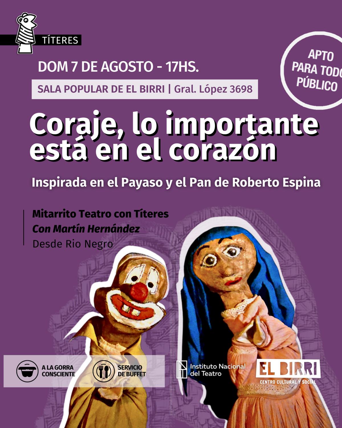 Para cerrar el primer fin de semana de agosto, llega “Coraje, lo importante está en el corazón” del grupo Mitarrito Teatro con Títeres de Río Negro. Se trata de un espectáculo apto para todo público que comienza a las 17.