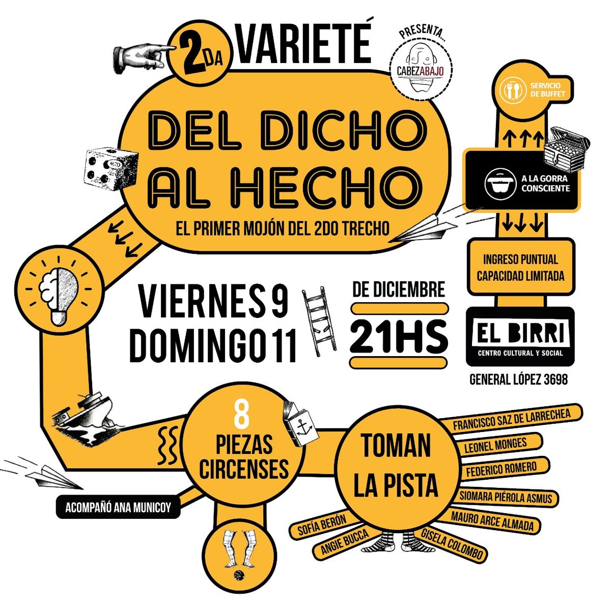 Esta propuesta se realizó durante los meses de octubre y noviembre en La Sala Popular de El Birri. “Del Dicho al Hecho, es una propuesta de entrenamiento escénico y acompañamiento personalizada para artistas circenses. Durante dos meses les participantes se dedicaron a investigar, crear y montar ocho piezas que plasman, singularmente, las búsquedas de cada une", contó Ana Municoy, su impulsora.