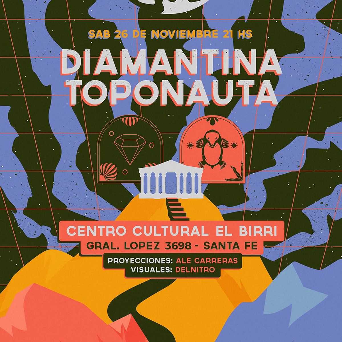 Los caminos recorridos por los principales integrantes de las dos bandas hablan de historia, de la mística del under musical santafesino, coexistiendo en escenarios de las primeras ediciones de las bienales de arte joven, así como en la prematura escena indie de la ciudad, allá por los años 2000. Con proyectos ya consolidados, el ahora los encuentra siempre movilizando cada una desde su lugar (Toponauta desde Bs. As.) y concertando este recital en nuestra Sala Popular, celebrando la bendición de sus respectivas canciones a través de tiempos y mutaciones varias. El espectáculo contempla proyecciones de Ale Carreras- quien estuvo a cargo de memorables videoclips para ambas bandas y proyectos cercanos- y visuales estroboscópicas del artista DelNitro.
