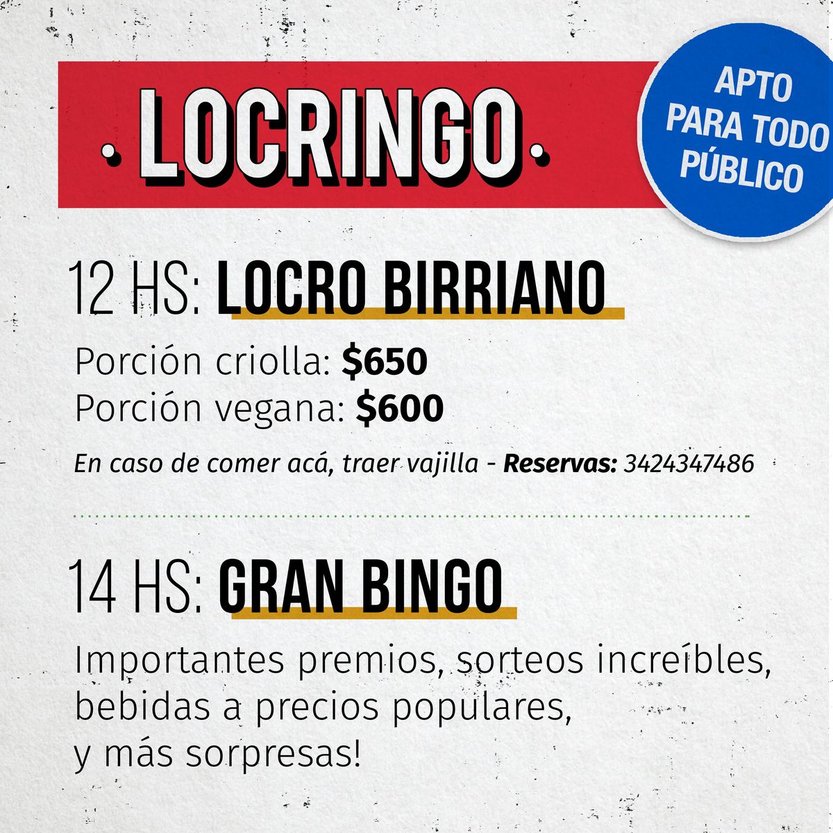 El Centro Cultural y Social El Birri invita a un evento que bajo el lema “¡Celebración popular a la cultura autogestiva!” conjuga locro y bingo: el “Locringo”. Al tradicional locro de las Productoras Birrianas, que convoca a numerosos comensales los días festivos, en esta ocasión se suma la propuesta de un mate bingo destinado a recaudar fondos para los proyectos de la organización. Se realizará el próximo sábado 9 de julio; a las 12 hs. se servirá el locro y a las 14 hs. comenzará el bingo. Para encargar la porción de locro –que también se puede solicitar para retirar– y reservar un lugar en la mesa para el almuerzo hay que comunicarse al teléfono 342 4 347-486.