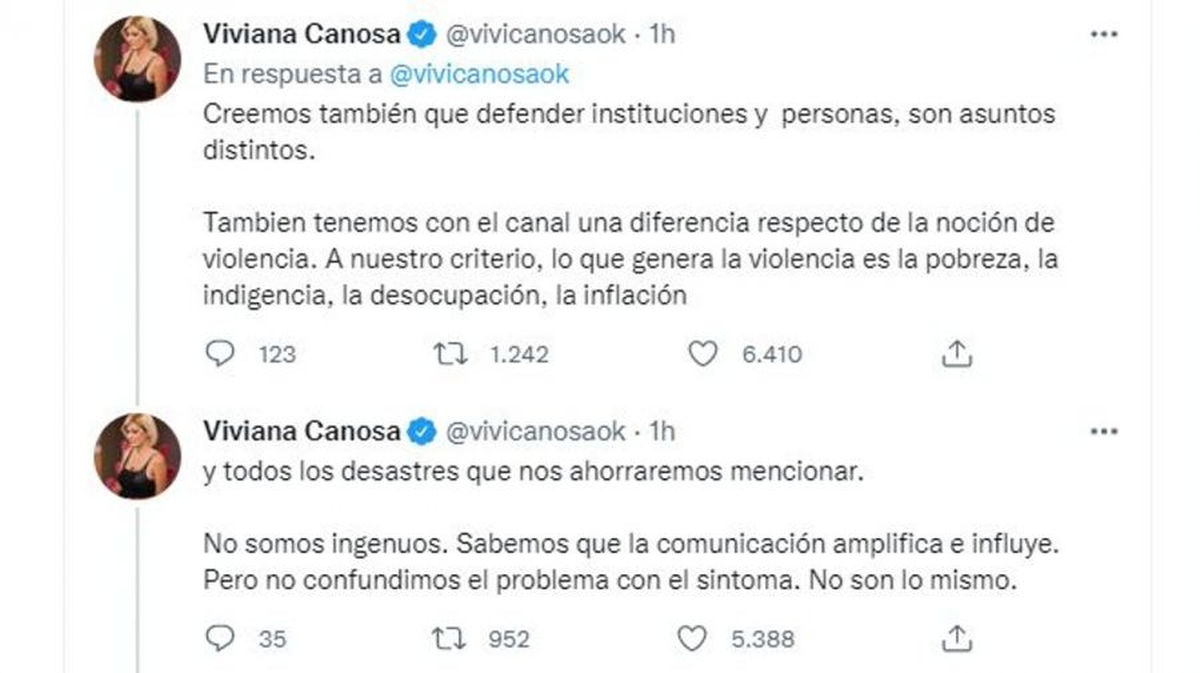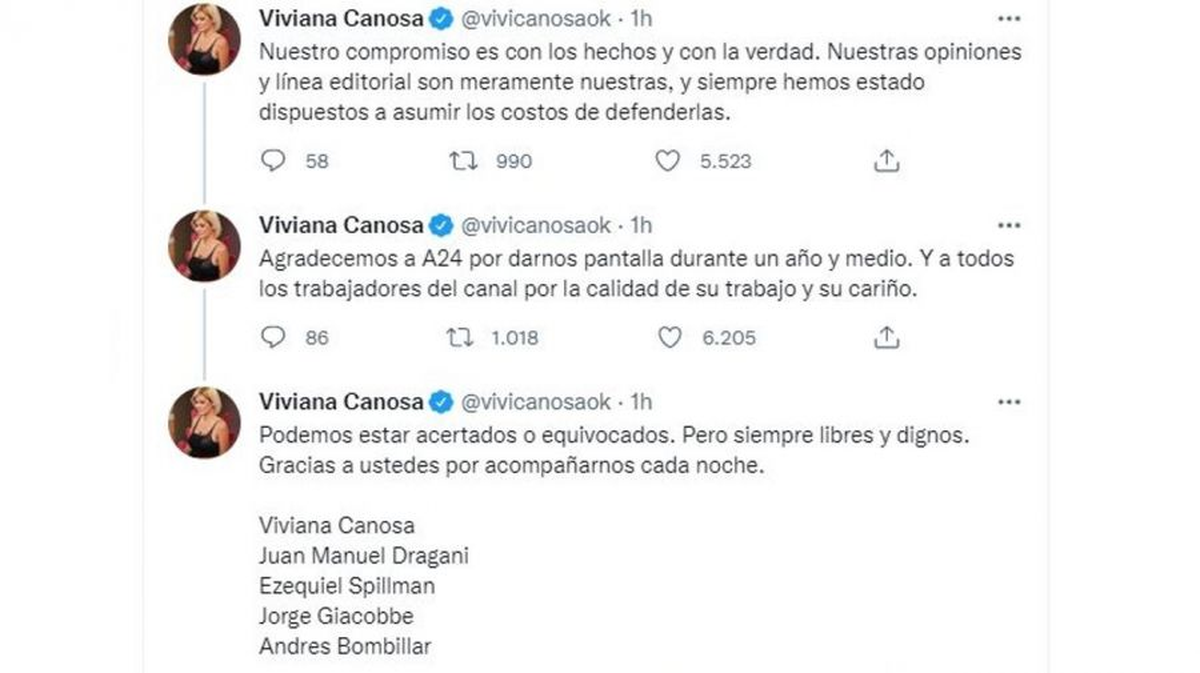 "Esta noche ha terminado nuestro ciclo #Vivianaconvos por A24. Hemos tenido diferencias con el canal en cuanto a la noción de libertad de expresión. Creemos que defender la libertad es también defender una institución básica", comenzó Canosa su descargo a través de Twitter.