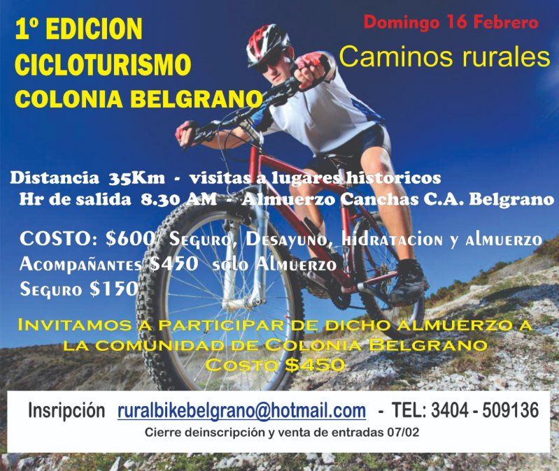 Si bien hay tiempo hasta el domingo para inscribirse, hasta antes de las 8.30 que marcarán la largada, los que deseen participar deben reservar su lugar para disfrutar de una experiencia completa que no solo consta del recorrido en bicicleta sino de conocer gente de diferentes lugares para culminar con un almuerzo en el Club Atlético Belgrano, ahí en el pueblo homónimo.