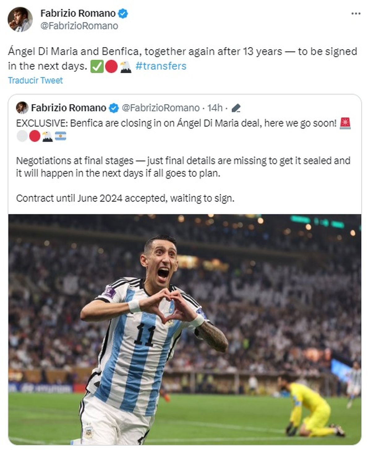 “Benfica está cerrando el acuerdo con Angel Di María. Las negociaciones están en la etapa final y restan detalles para que en los próximos días se concrete la operación”, dijo Romano, en relación a la posibilidad de que el exjugador de Juventus de Italia regrese al vigente campeón de la Primeira Liga portuguesa.