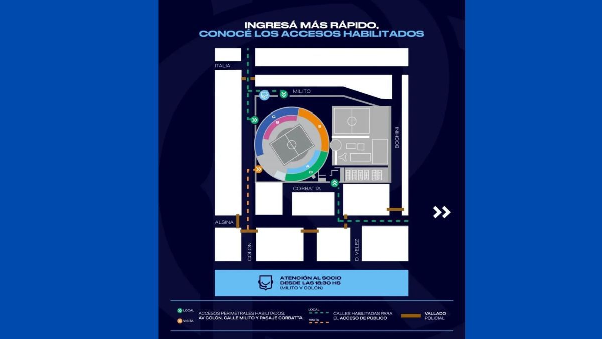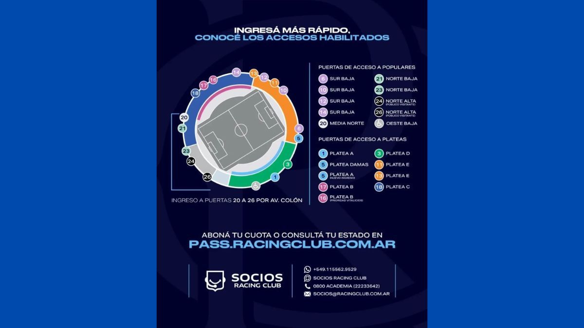 El público de Racing ingresará al estadio por el acceso de calle Gral. Paz y Colón, Italia y Colón, Alsina y Díaz Vélez.