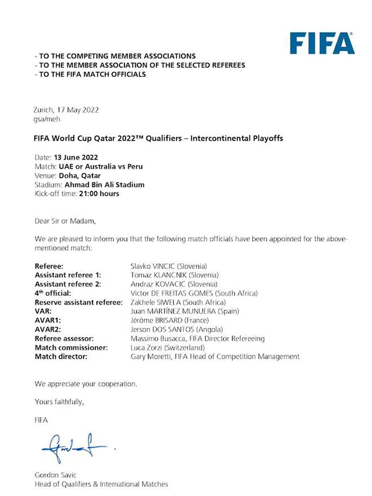 Mediante un comunicado en su web oficial, la FIFA confirmó a la terna arbitral para el duelo de la selección peruana en el repechaje rumbo al Mundial de Qatar 2022. El juez principal será un esloveno y los jueces de línea serán de la misma nacionalidad. Sin embargo, el cuarto árbitro y el asistente de reserva serán de Sudáfrica. Por otro lado, la voz principal en el VAR será de un español.