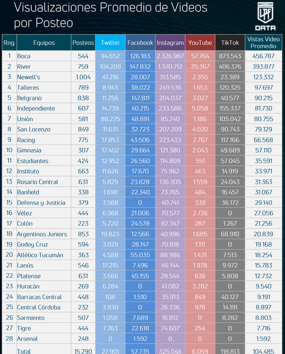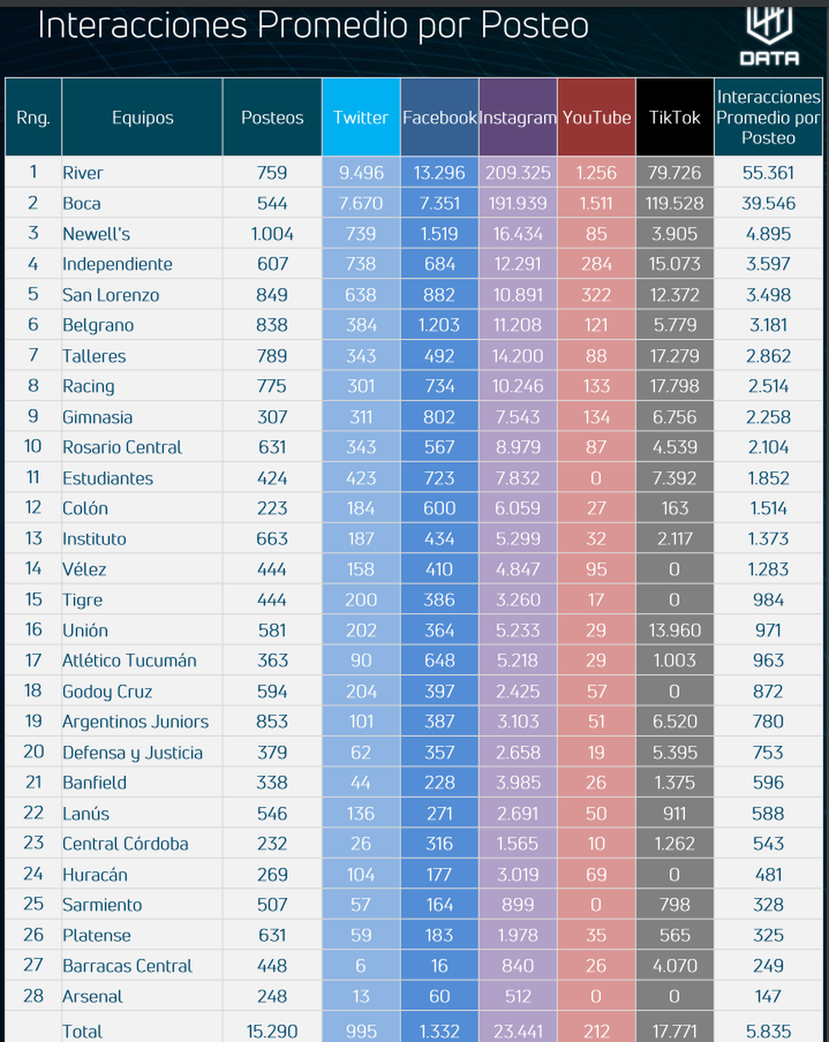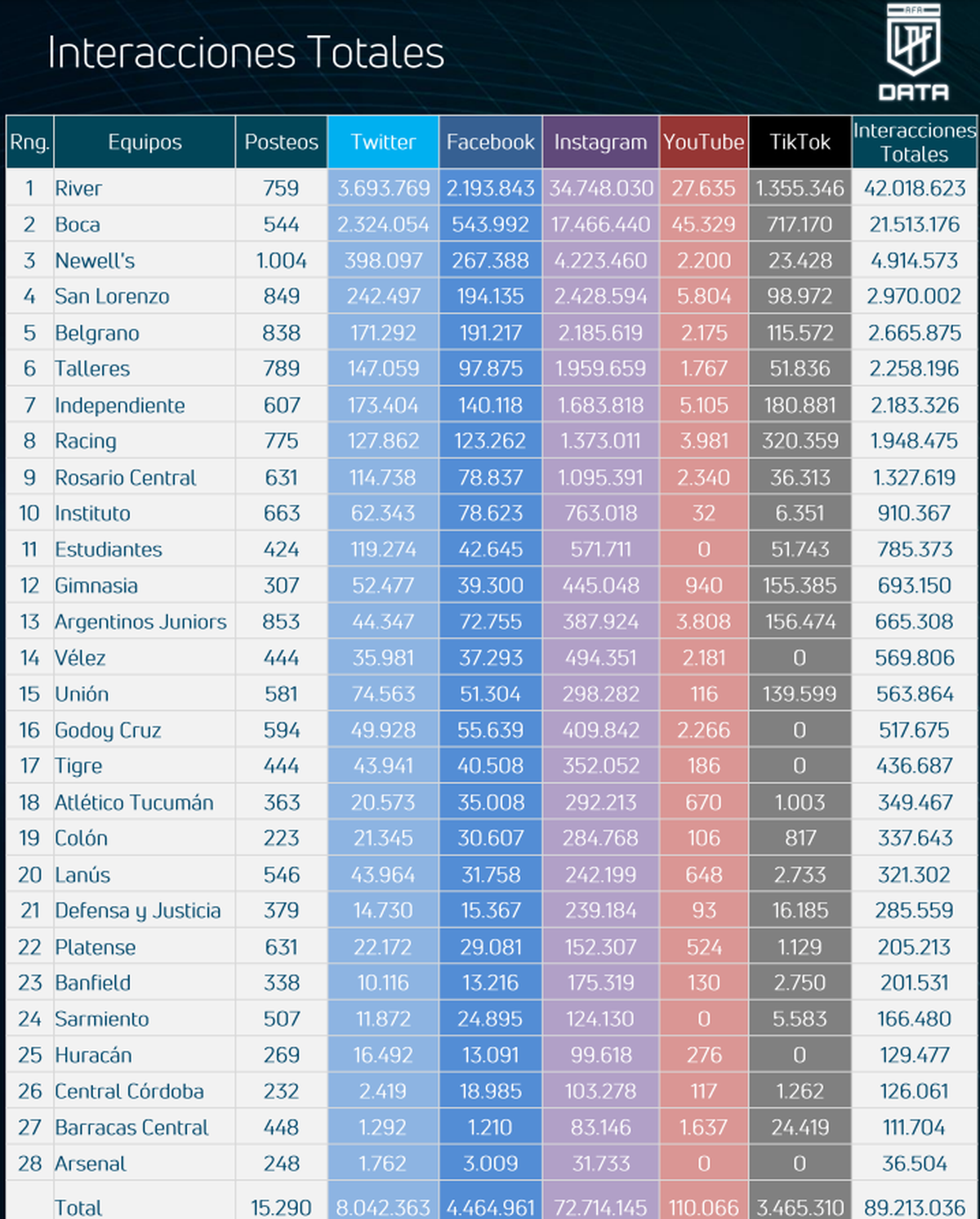 Boca y River de Buenos Aires junto a Newell's de Rosario son los tres equipos que mejor números cuentan sobre las interacciones. Barracas Central y Arsenal cierran la tabla.