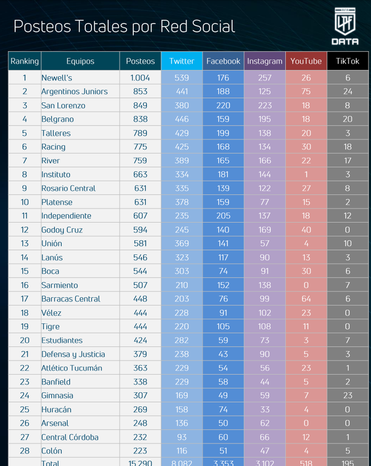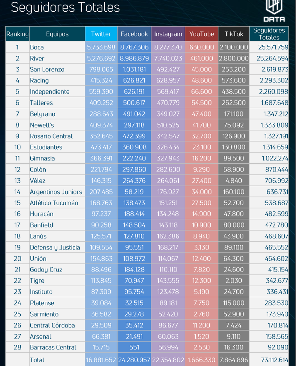 El podio de los equipos con más seguidores en las redes sociales lo integran Boca, River y San Lorenzo. Colón se encuentra en el puesto 12 con un poco más de 870 seguidores mientras que Unión se ubica en el lugar 20 con 454.606 seguidores.